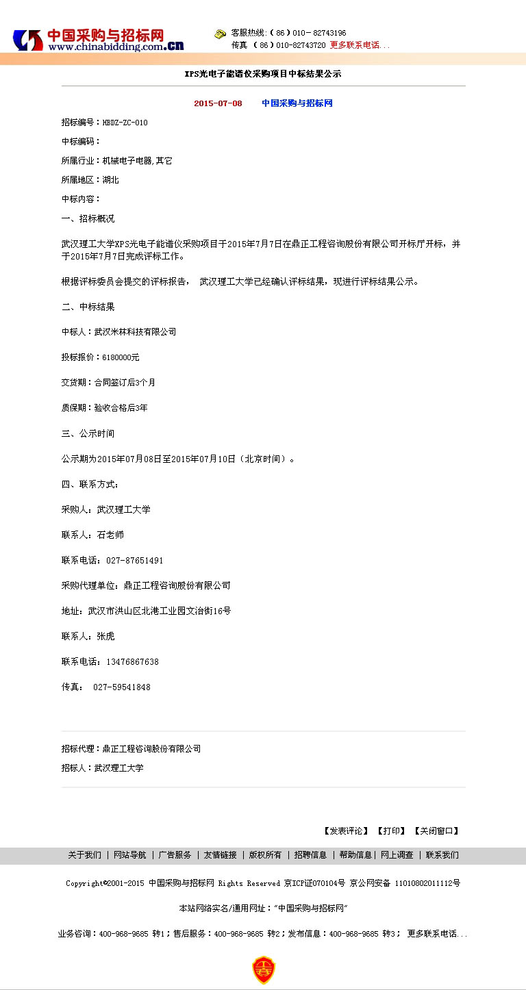 XPS光電子能譜儀采購項目中標結果公示
