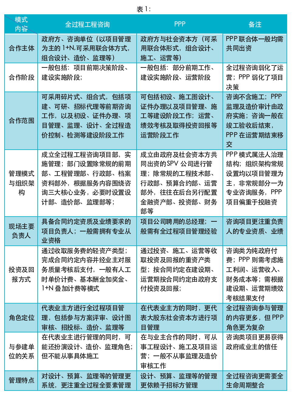 從上面的分析中不難看出,PPP項目關(guān)注合法合規(guī)手續(xù),全過程咨詢關(guān)注技術(shù)及管理協(xié)調(diào);PPP項目更關(guān)注投資收益及增值回報,全過程咨詢關(guān)注投資控制及進(jìn)度;PPP項目服務(wù)鏈更長,全過程咨詢重點是建設(shè)期。