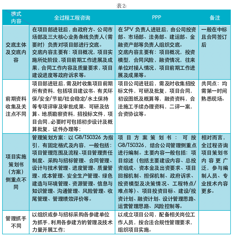 正如前面所述,因PPP項目管理為法人治理結(jié)構(gòu),項目公司管理中需同步考慮各股東方利益,而全過程咨詢項目部以業(yè)主利益至上為原則,因此建設(shè)期的管理差異還是較大的,主要表現(xiàn)在以下方面: