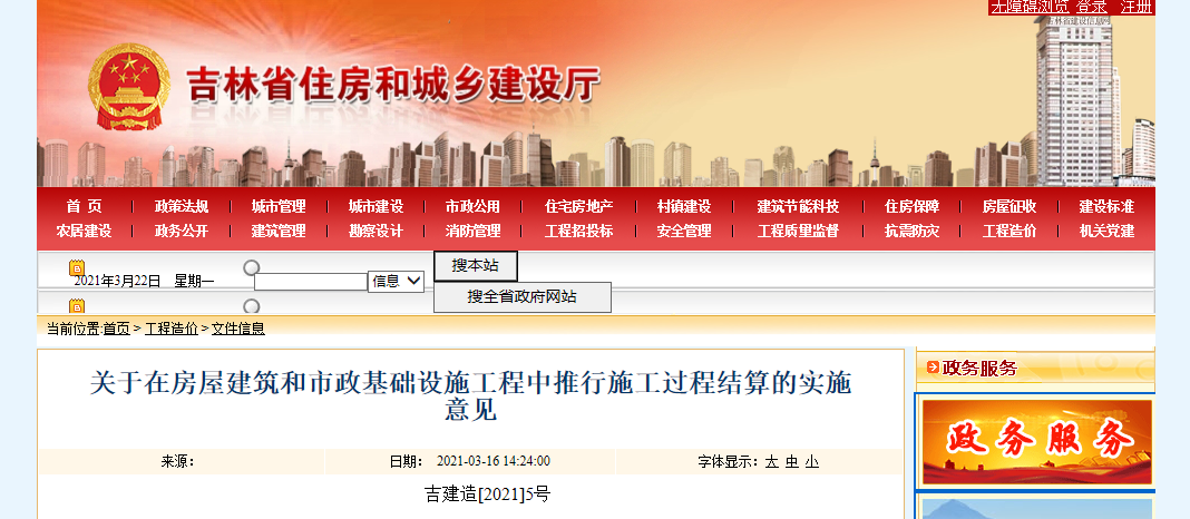3月16日,吉林省住建廳發(fā)布《關(guān)于在房屋建筑和市政基礎(chǔ)設(shè)施工程中推行施工過程結(jié)算的實(shí)施意見》。施工合同工期一年(含一年)以上的房屋建筑和市政基礎(chǔ)設(shè)施工程,推行施工過程結(jié)算。鼓勵(lì)施工過程結(jié)算實(shí)行全過程造價(jià)咨詢服務(wù):