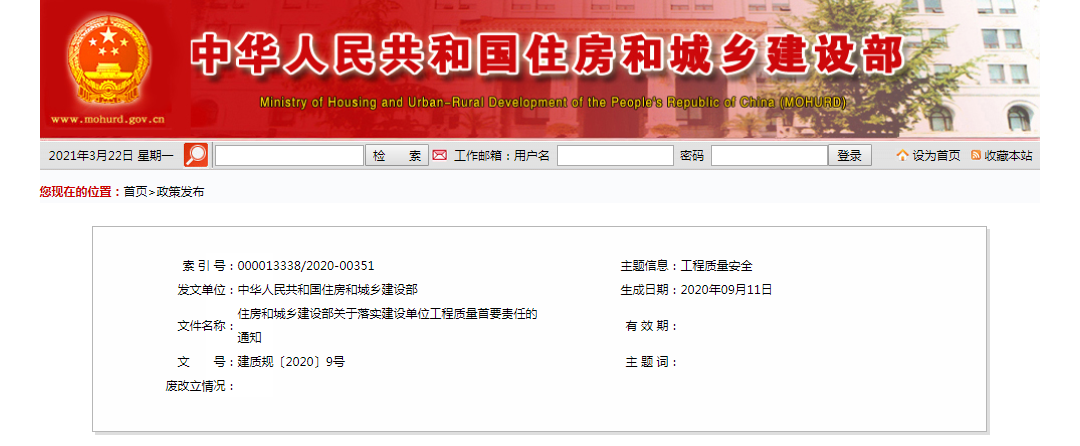 2020年9月23日,住建部官網(wǎng)發(fā)布《關(guān)于落實(shí)建設(shè)單位工程質(zhì)量首要責(zé)任的通知》,嚴(yán)格落實(shí)建設(shè)單位工程質(zhì)量首要責(zé)任。同時(shí)提出: