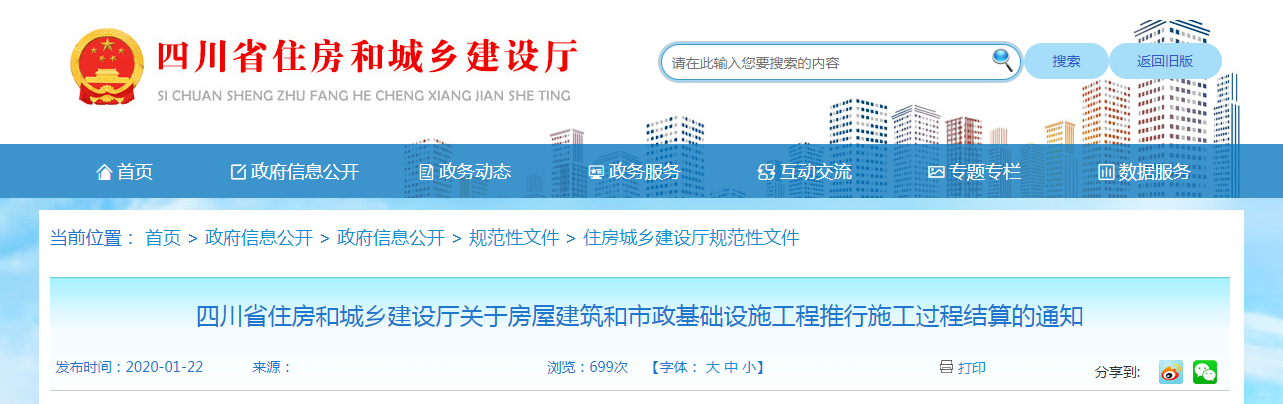 2020年1月22日,四川發(fā)文,全省房屋建筑和市政基礎(chǔ)設(shè)施工程施工合同工期兩年以上的新開工項(xiàng)目要積極推行施工過程結(jié)算。從2020年3月1日起執(zhí)行,有效期5年。