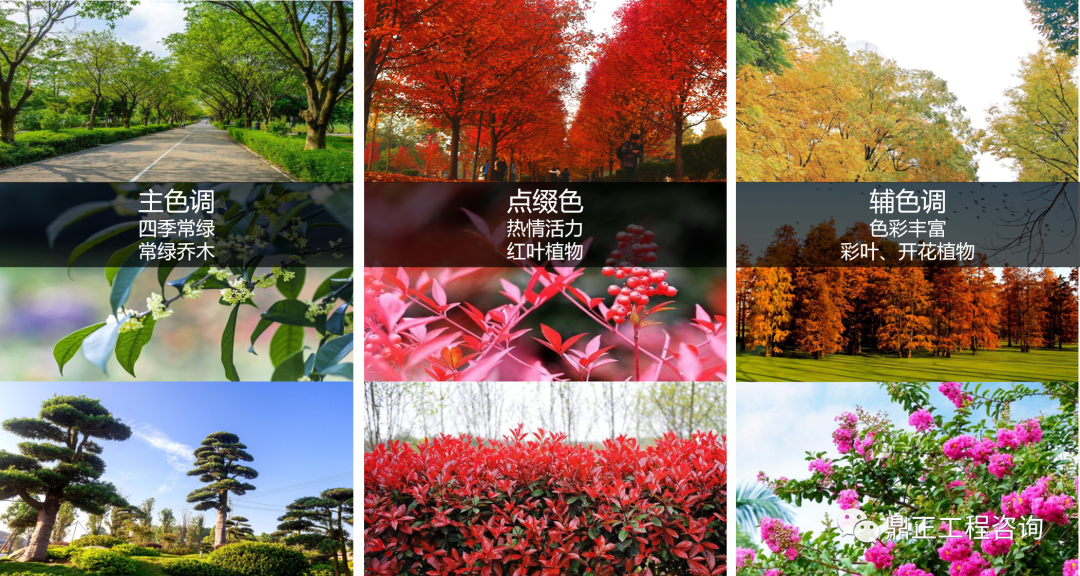 “生態(tài)園區(qū),四季有花,處處皆景”——以常綠植物襯底,紅色植物點(diǎn)睛,色葉交融。
