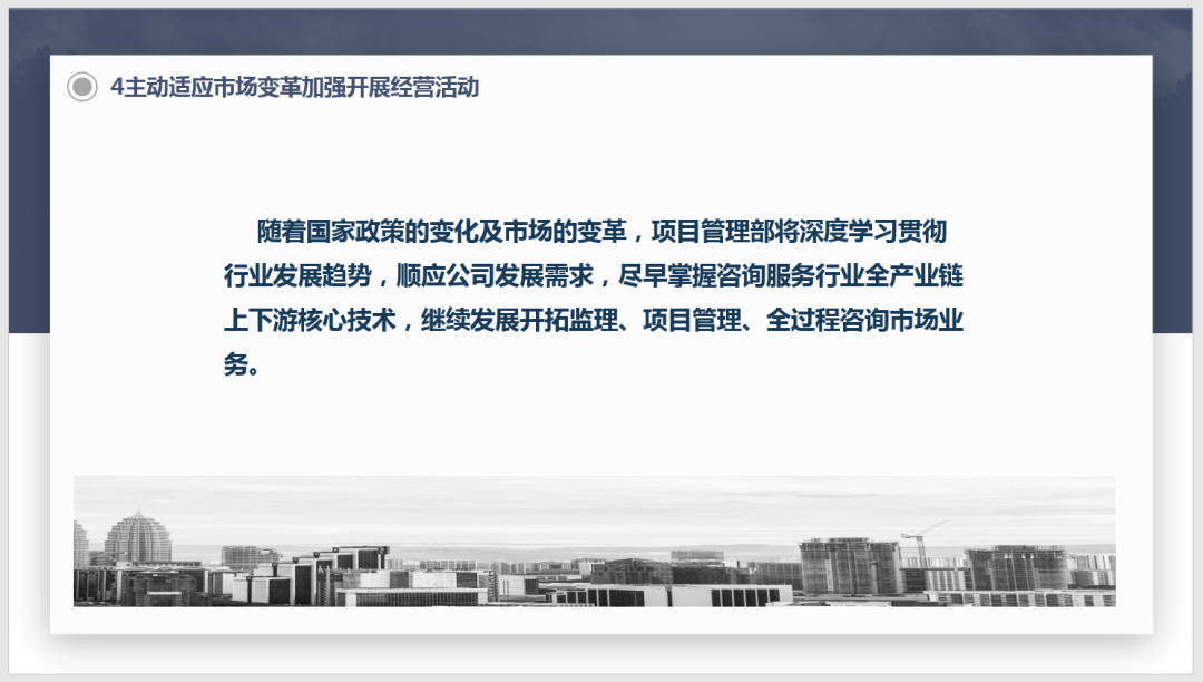 2、項目管理事業部:及時總結已完及在建全過程工程咨詢項目管理經驗,緊跟公司發展戰略定位,不斷提高工程咨詢全產業鏈上下游核心技術水平,積極發展開拓工程監理、項目管理、全過程工程咨詢業務。
