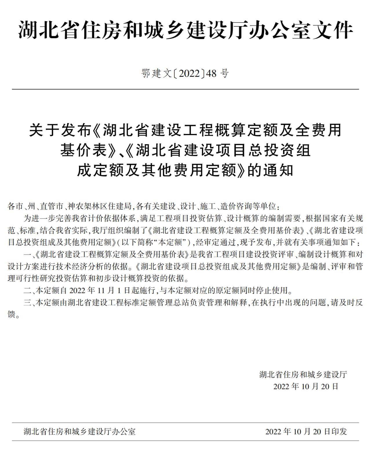 湖北省住建廳發布《湖北省建設工程概算定額及全費用基價表》《湖北省建設項目總投資組成及其他費用定額》的通知