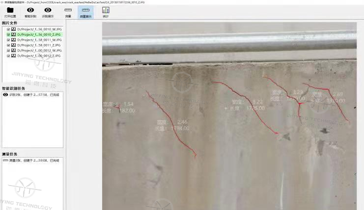 對于斜拉索橋,其受力模式較為復雜,多個關鍵部位均有可能產生受力裂縫或其他病害。珈鷹利用自主研發的智能識別測量軟件對已采集的高清圖像進行智能、高效處理,精準定位受損位置,捕捉病害。