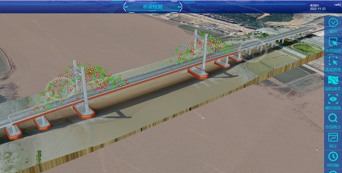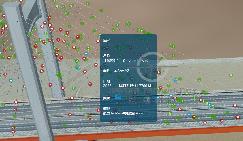 根據拍攝的高清圖像重建橋梁三維模型,并定量標示各類缺陷的位置,并且搭建獨立的大數據云平臺,實現橋梁缺陷與病害的可視化,對橋梁問題進行三維立體化復現,為橋梁安全運行提供數據支撐。