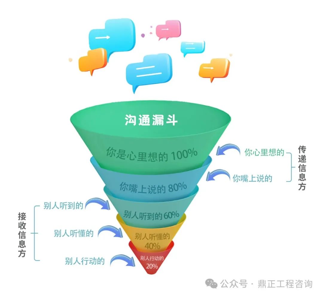 從溝通方到接收方,中間涉及很多環節,也或多或少存在“溝通漏斗”的情況,比如表達不清醒、信息損耗、理解偏差、反饋有誤等。