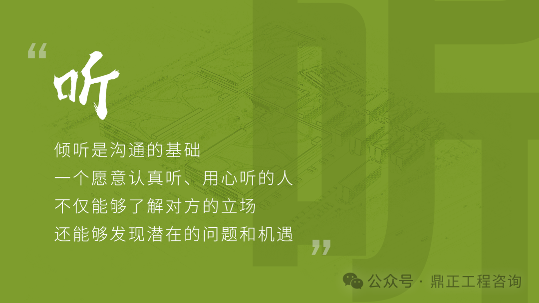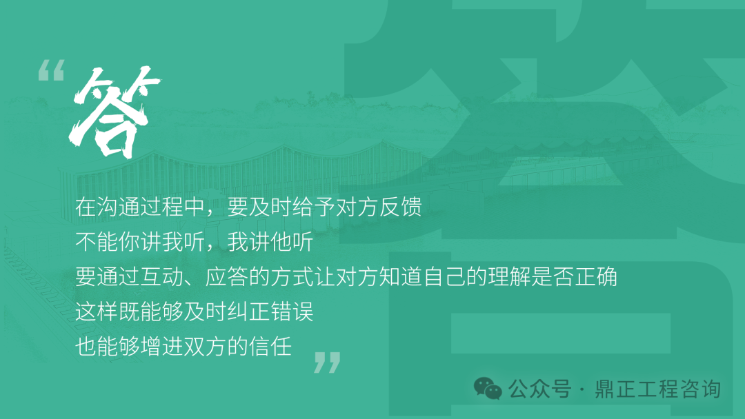 交流要看對象,不能對牛彈琴。與農民工交流要用農民工聽得懂的語言;與同行或其他咨詢機構交流要用專業語言;與直接上級交流要及時反饋并提出合理建議;與客戶交流,要從客戶的視角出發,為其提供最優解決方案。