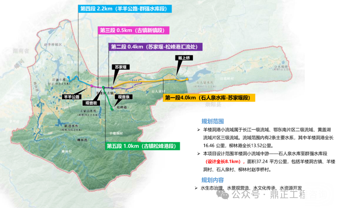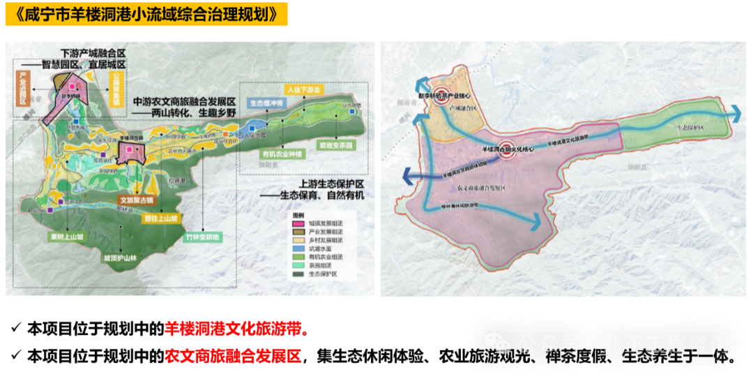 堅(jiān)持下位規(guī)劃服從上位規(guī)劃、下級(jí)規(guī)劃服務(wù)上級(jí)規(guī)劃,形成流域治理“一盤棋”。落實(shí)上位規(guī)劃對(duì)本項(xiàng)目的定位、功能、治理重點(diǎn)等的相關(guān)要求,找準(zhǔn)自身工作的側(cè)重點(diǎn)以及與全局工作的結(jié)合點(diǎn),才能保證設(shè)計(jì)“不偏題”。以本項(xiàng)目為例,上位規(guī)劃將羊樓洞港小流域劃分為三個(gè)治理區(qū),本項(xiàng)目位于農(nóng)文商旅融合發(fā)展區(qū)和羊樓洞港文化旅游帶,因此本項(xiàng)目不僅要關(guān)注到水生態(tài)、水環(huán)境的修復(fù)提升,還要考慮流域生態(tài)價(jià)值的轉(zhuǎn)化及對(duì)旅游產(chǎn)業(yè)的推動(dòng),利用好流域內(nèi)的茶產(chǎn)業(yè)特色以及茶馬古鎮(zhèn)的歷史文化特色,實(shí)現(xiàn)生態(tài)美與產(chǎn)業(yè)綠深度融合。