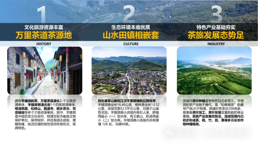 以本項(xiàng)目為例,羊樓洞港小流域地處幕阜山脈和江漢平原接壤的丘陵地帶,流域內(nèi)有羊樓洞港、柳林港兩條水系,整體呈現(xiàn)山、水、田、鎮(zhèn)相嵌套的格局;流域內(nèi)擁有明清時(shí)期國(guó)際茶葉貿(mào)易名鎮(zhèn)——羊樓洞古鎮(zhèn),這里是歐亞萬(wàn)里茶道的源頭;流域內(nèi)茶葉種植特色歷史悠久,茶旅產(chǎn)業(yè)發(fā)展態(tài)勢(shì)正足,并且已初步形成茶、稻、竹、芍、果等多元化農(nóng)作物種植格局。