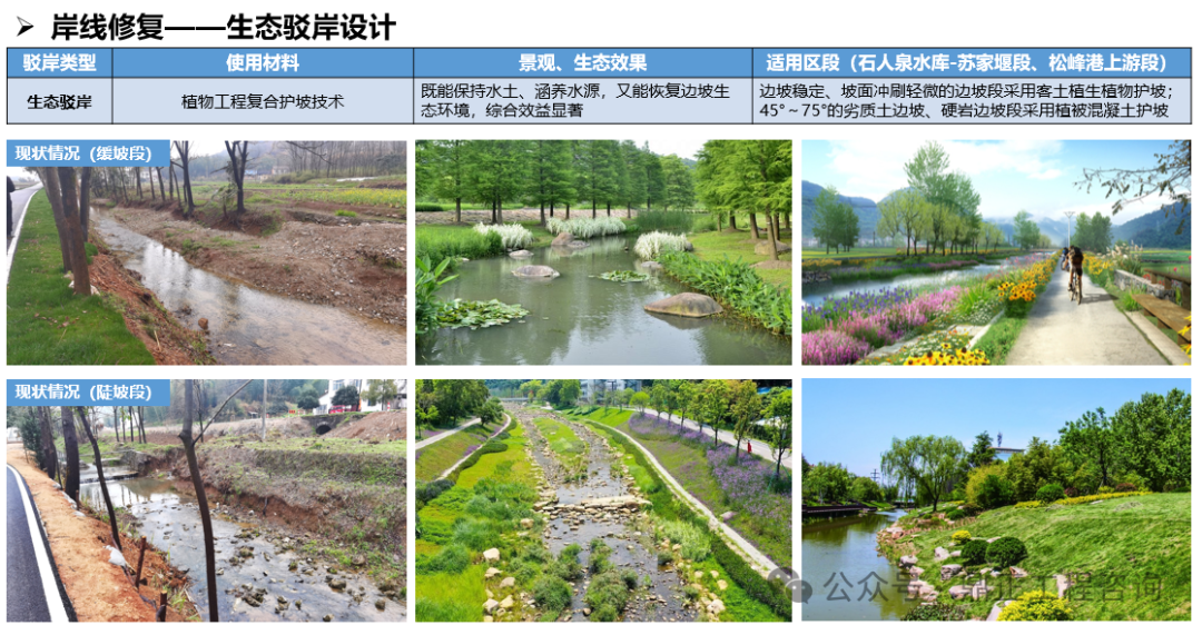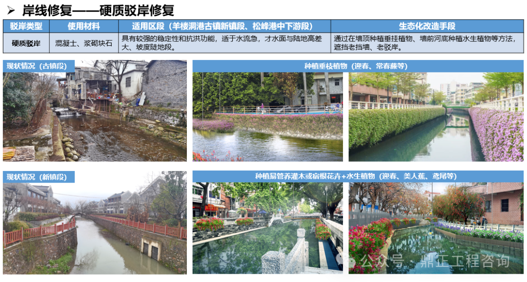 生態(tài)方面,打造“羊樓生態(tài)廊”,以水提質(zhì),修復(fù)流域生態(tài),即實(shí)施一批駁岸整治、水質(zhì)提升、生境構(gòu)建等河道治理措施進(jìn)行水岸共治。針對(duì)水生態(tài)的修復(fù),根據(jù)不同水體類型提出技術(shù)方式;對(duì)于岸線的修復(fù),又針對(duì)不同的駁岸類型提出適用的整治措施。