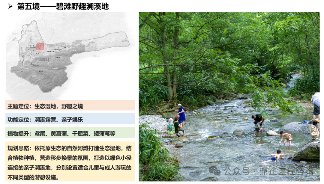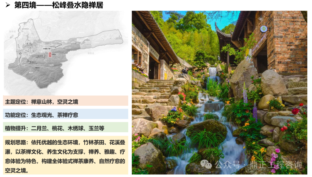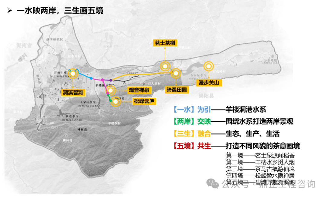 一水為引,指出治理對(duì)象,即羊樓洞港小流域;兩岸交映,指出治理范圍,即包括上下游、左右岸、堤內(nèi)外;三生融合,指出治理路徑,即走好生產(chǎn)、生活、生態(tài)協(xié)調(diào)發(fā)展之路;五境共生,即為五個(gè)治理分區(qū),通過分段體現(xiàn)差異化分區(qū)的理念,以線帶面也利于實(shí)施過程中分期分段逐步推進(jìn)。每個(gè)分區(qū)都有具體的功能定位、治理目標(biāo)、治理標(biāo)準(zhǔn),因此不同分區(qū)名稱就是該區(qū)治理特色的高度凝練,既要體現(xiàn)水系的區(qū)位,如“茗士泉源”對(duì)應(yīng)相公泉,“茶馬古鎮(zhèn)”對(duì)應(yīng)羊樓洞古鎮(zhèn),“松峰”對(duì)應(yīng)松峰山;也要體現(xiàn)水系的形態(tài),如“泉”、“溪”、“疊水”等;還要體現(xiàn)水系的功能,如“稻香”對(duì)應(yīng)田園塘渠,“水鄉(xiāng)”對(duì)應(yīng)生活河道,“碧灘”對(duì)應(yīng)生態(tài)濕地等。