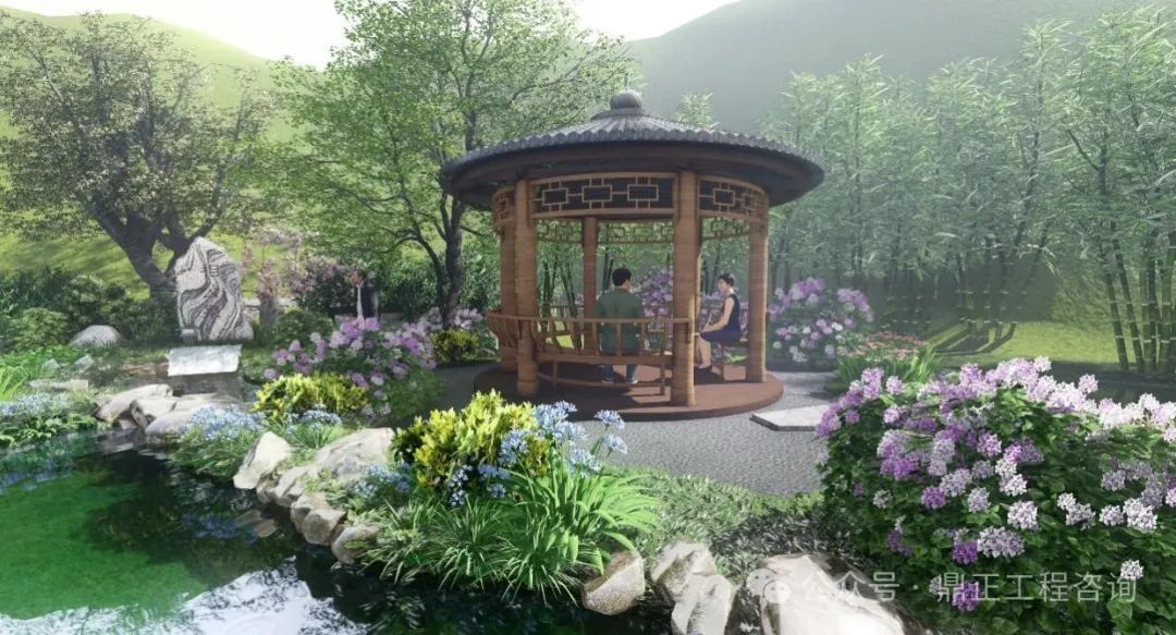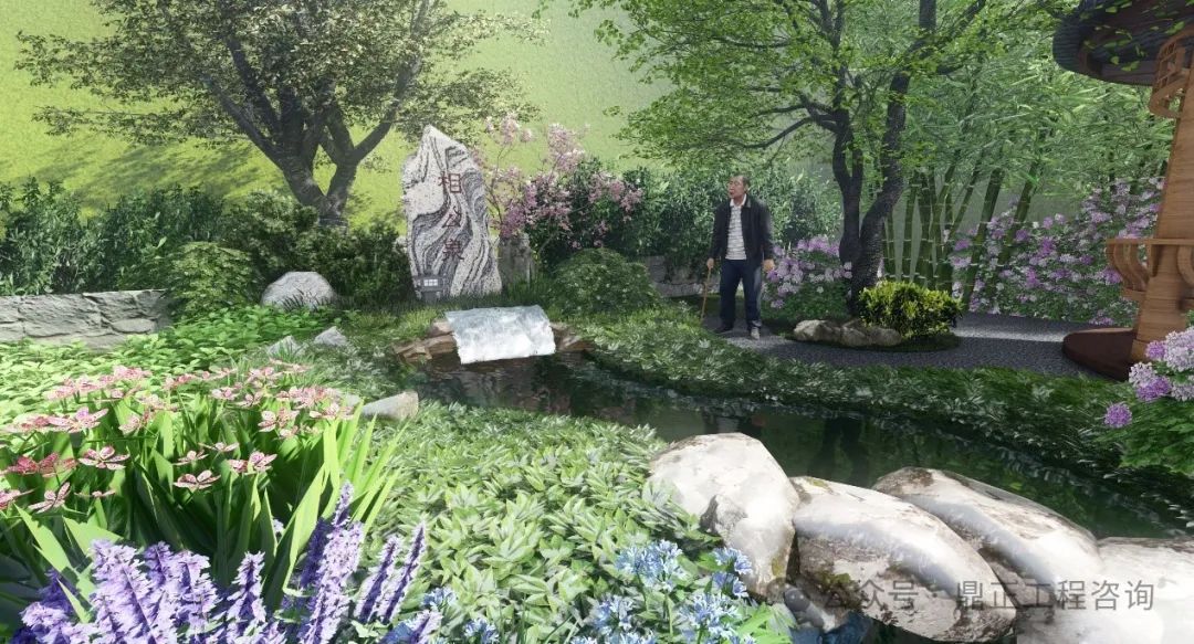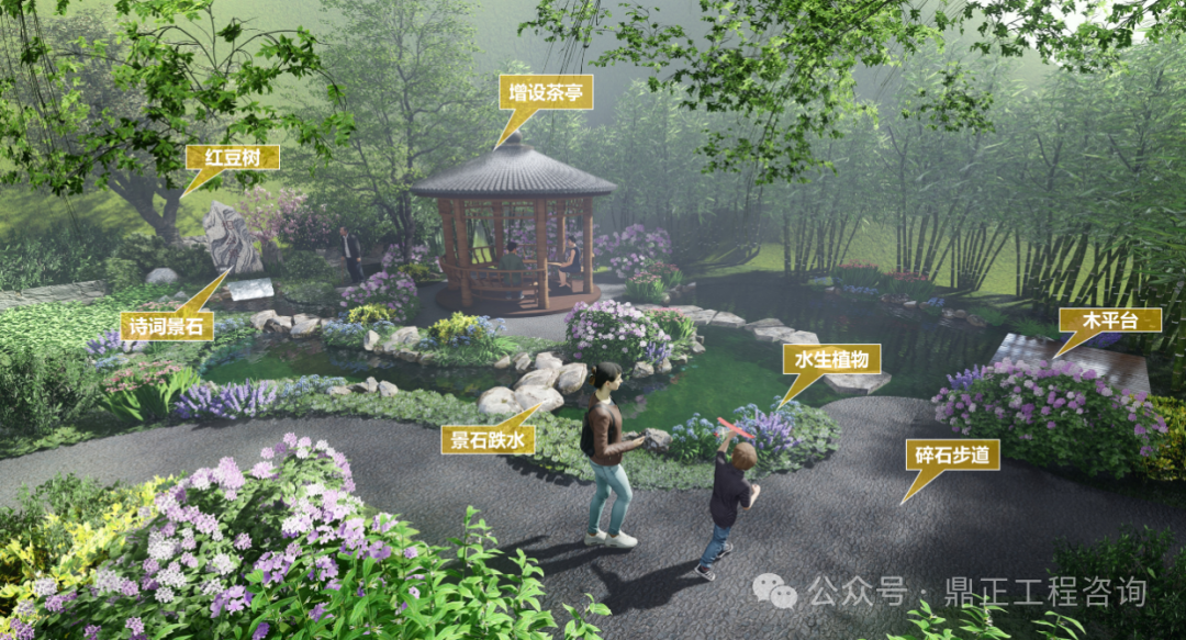 水景觀水文化打造:通過深挖相公泉?dú)v史文化內(nèi)涵,進(jìn)行本地印象提煉。“相公”一詞在古代,是妻子對(duì)丈夫的稱呼,也是君子、生員(秀才、相公)、宰相的另一種叫法。君子愛茶,沏茶品茗,修煉品性,以茶可雅志,茶是象征著塵世的純潔。設(shè)計(jì)從自然山水出發(fā),落位于閑情逸致設(shè)計(jì)基調(diào),泉眼處采用題字景石配上一棵姿態(tài)旖旎的紅豆,視線端頭一幅竹影錦鯉、花木跌水的畫面映入眼簾,兩側(cè)的樹木林立,開合有致,整個(gè)節(jié)點(diǎn)的中心是一座圓頂茶亭,在亭中,一壺清茶問道,仿佛拉近了古今往事,也增加了場(chǎng)地的記憶,呈現(xiàn)出 “千年古樹頻招手,萬(wàn)年清泉溢清香”的意境。