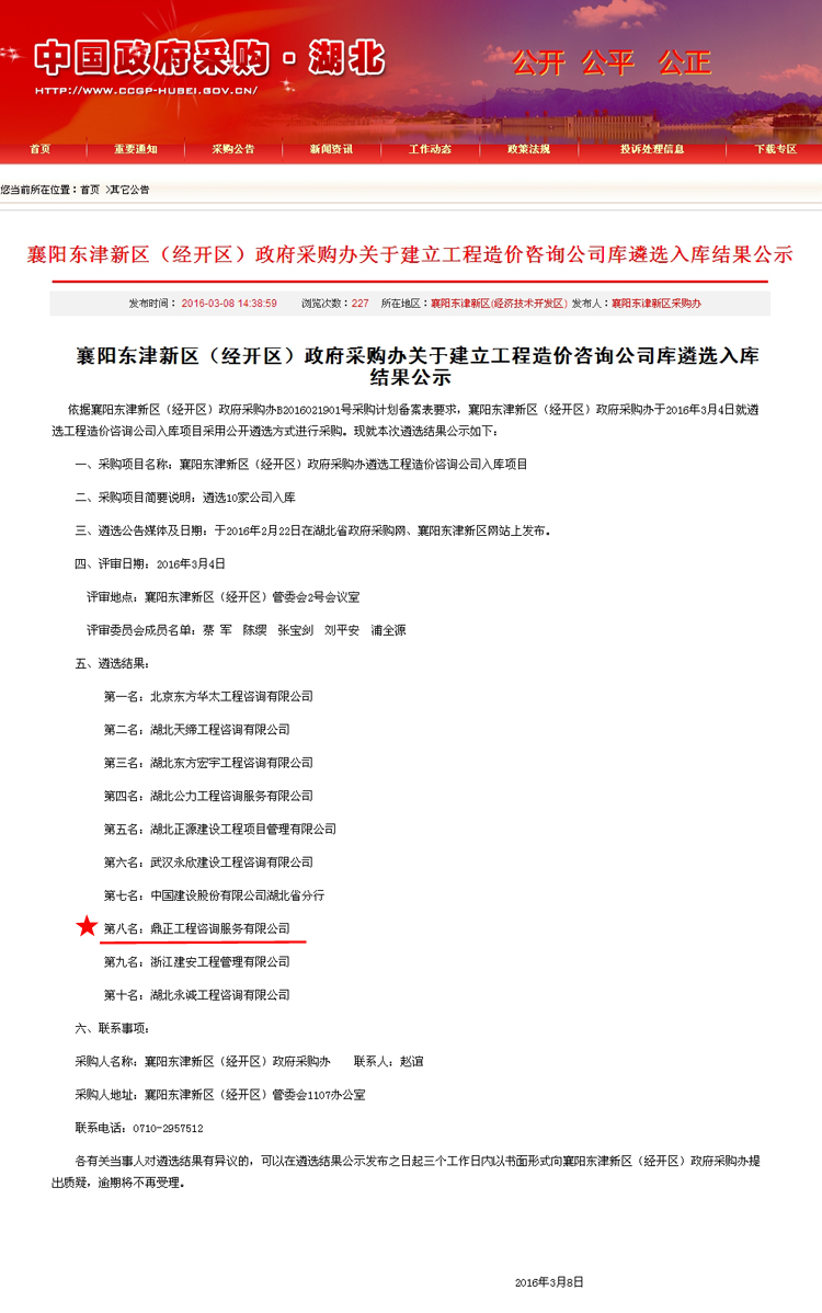 【經營成果】我司入圍襄陽東津新區(經開區)政府采購辦工程造價咨詢公司庫