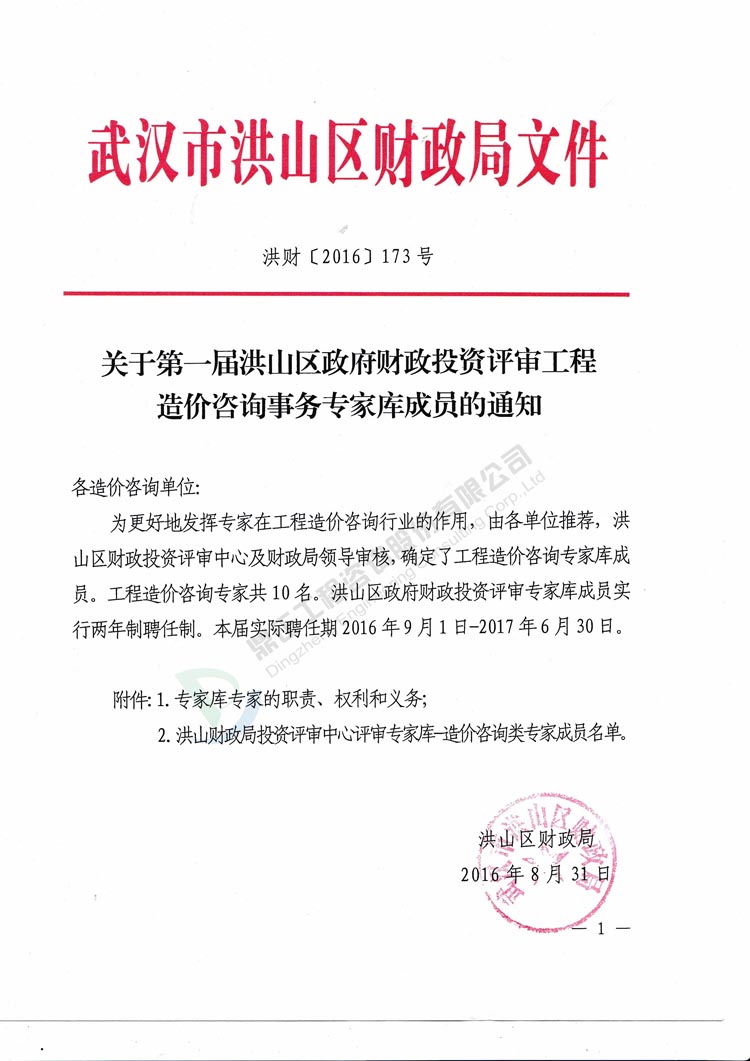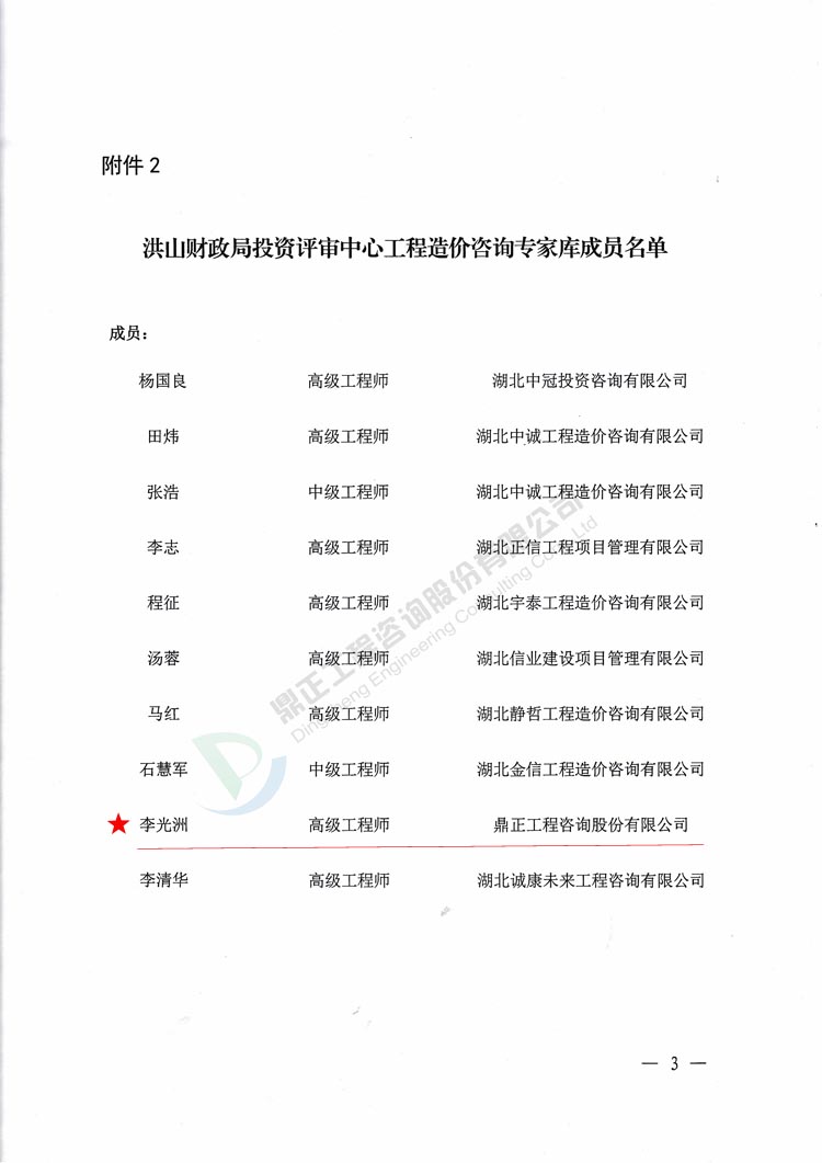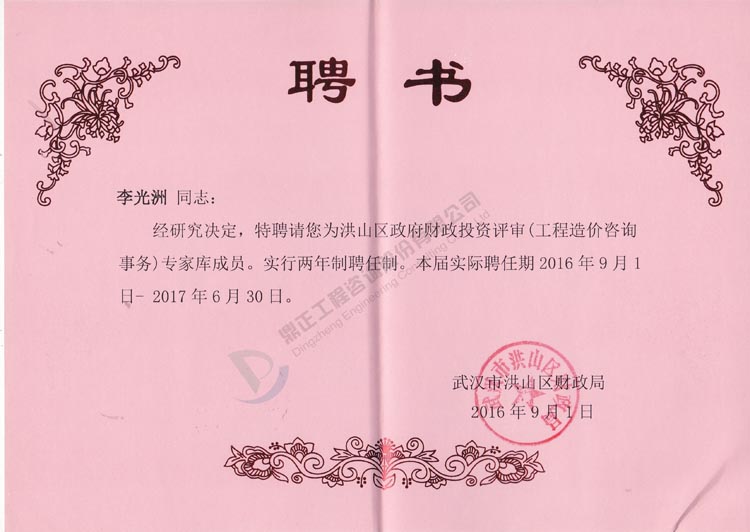 我司李光洲同志被武漢市洪山區財政局特聘為洪山區政府財政投資評審(工程造價咨詢事務)專家