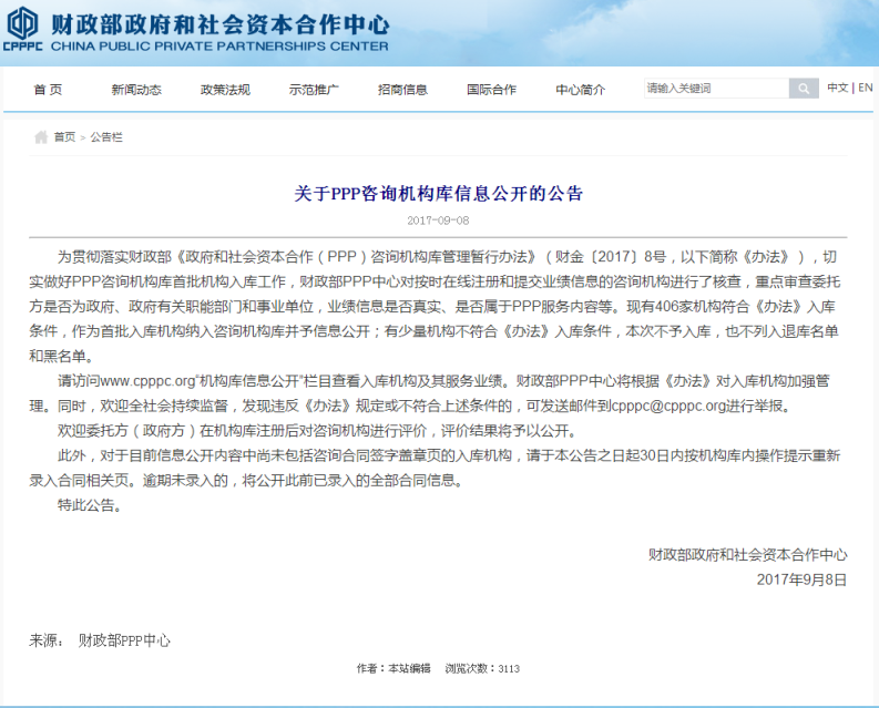 2017年9月8日,財(cái)政部PPP中心發(fā)布了《關(guān)于PPP咨詢機(jī)構(gòu)庫(kù)信息公開(kāi)的公告》,406家機(jī)構(gòu)符合《政府和社會(huì)資本合作(PPP)咨詢機(jī)構(gòu)庫(kù)管理暫行辦法》(財(cái)金【2017】8號(hào))入庫(kù)條件,鼎正公司成功入選財(cái)政部首批PPP咨詢機(jī)構(gòu)庫(kù)。