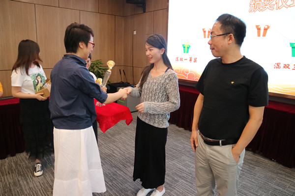 副總經(jīng)理毛迎霞為混雙三等獎獲得者王雁然、張愉頒獎