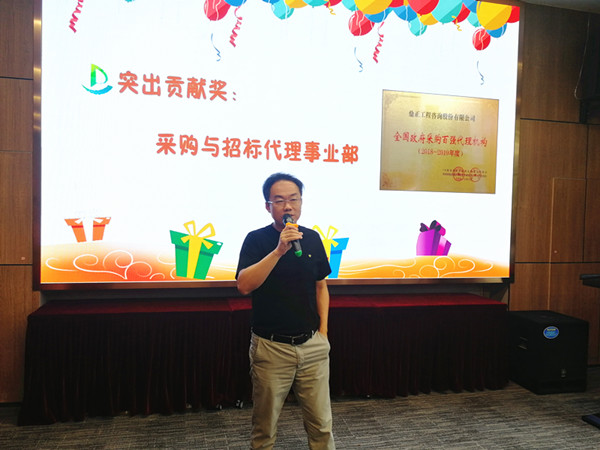 值得一提的是,今年七月我司憑借專業(yè)的服務(wù)、完善的內(nèi)控制度從近千家政府采購代理機(jī)構(gòu)中脫穎而出,獲得首屆“全國政府采購百強(qiáng)代理機(jī)構(gòu)(2018-2019年度)”榮譽(yù)稱號,這一榮譽(yù)稱號離不開采購與招標(biāo)事業(yè)部全體成員積極主動的參評。董事長王雁然為采購與招標(biāo)事業(yè)部頒發(fā)突出貢獻(xiàn)獎,并號召大家向采購與招標(biāo)事業(yè)部學(xué)習(xí)大局意識和吃苦耐勞的工作作風(fēng)。