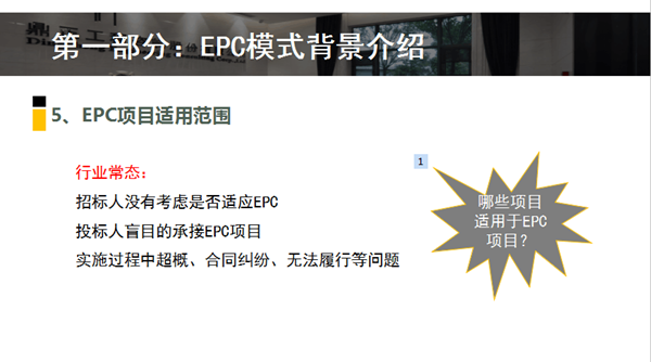 下午,采購與招標代理事業部的潘勝強帶來了《EPC項目招標實務》的主題培訓。潘勝強首先介紹了EPC模式的背景,包含工程總承包的主要模式,EPC發展狀況,EPC項目適用范圍,招標流程等多方面內容。隨后對EPC項目招標要點進行了解析,結合相關政策文件對工程總承包發包階段和條件、資格條件的設置、EPC項目前期單位是否可以參與后期投標、合同計價方式、分包原則進行了詳細的解讀。